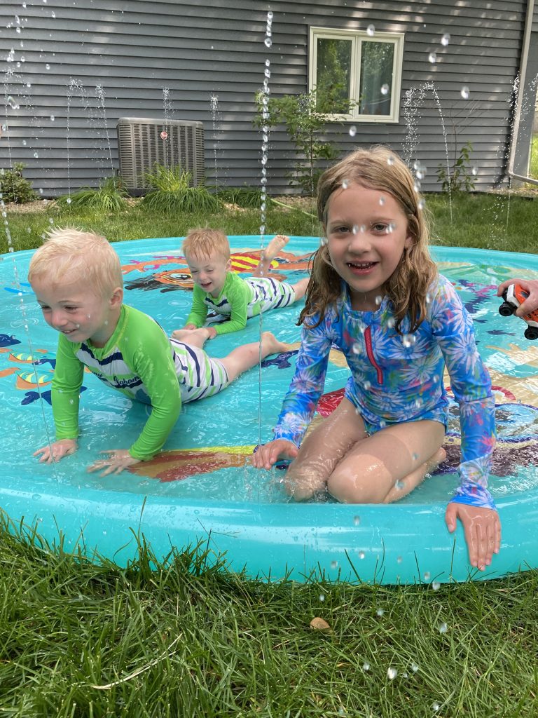 The kids just kept all playing together and I’m pretty sure they’d be playing there at this moment if we didn’t stop them and put them to bed. After getting the twins ready for bed and changed into their pajamas the adults got distracted and they ended up running back and forth through the hose while Gisele and Brooke sprayed them. To remedy the situation Erin peeled off Charlie’s pajamas and he may have been running around naked for a bit until Gisele said it was awkward for her lol.